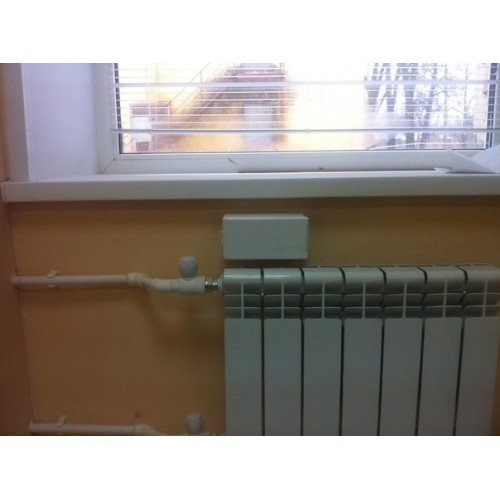 В стене между радиатором отопления и подоконником сверлится отверстие Ø65-68 мм и глубиной 70-100 мм под трубный утеплитель.